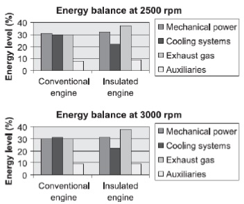 Ha existido la idea de que si las superficies internas de la cámara de combustión se mantienen a mayor temperatura, las pérdidas de calor pueden ser menores (Morel [13],[14]), lo que ha dado lugar a la experimentación con aislamientos de las superficies empleando materiales cerámicos (Taymaz [15] realizó una revisión bastante extensa de los trabajos más relevantes realizados en este tema). En las gráficas de la Figura 4 se ilustran los balances energéticos de un motor con aislamiento y sin aislamiento, reproducidas del trabajo de Descombes [16], quien presentó los resultados de un estudio experimental de un motor Diesel sobrealimentado. Este motor tenía un aislamiento en la precámara de combustión y un recubrimiento cerámico en la cara superior del pistón. Los resultados de las pruebas mostraron que la eficiencia energética del motor permanece casi constante y que la reducción de las pérdidas de calor a las paredes redunda en un incremento simultáneo de la energía contenida en los gases de escape. La fracción acumulada de los flujos de calor hacia el refrigerante, de un lado, y hacia el escape, por otro lado, permanece casi constante cuando el motor opera bajo carga. Una análisis bastante fundamental de las implicaciones termodinámicas del empleo de aislamientos y los posibles alcances, a partir de la Segunda Ley de la Termodinámica, fue realizado por Caton [17], quien entre otras conclusiones afirma que, promoviendo que los procesos de combustión se realicen a mayores temperaturas (como resultado, por ejemplo, de la utilización de aislamientos cerámicos en la cámara de combustión), se minimiza la destrucción de la disponibilidad de la energía del combustible resultado de los procesos de combustión, aumentándose las temperaturas de los gases de escape, e incrementándose los niveles de disponibilidad en ellos.
