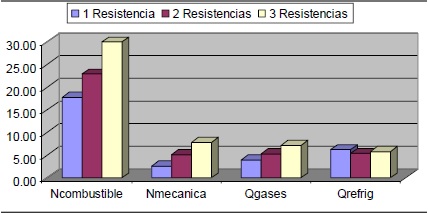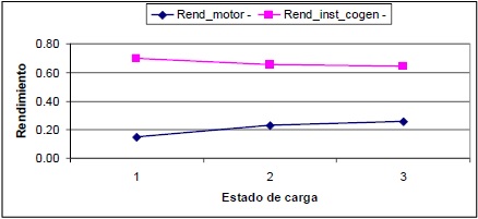 Se puede ver de la figura 7 y de la tabla 3, como era de esperarse, que el rendimiento del motor crece con la carga y así mismo decrece el de la instalación de cogeneración.