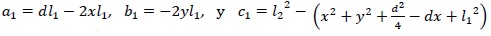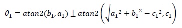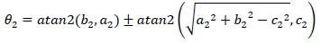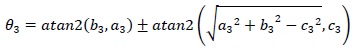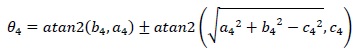 [8]Para determinar los ángulos θ3 y θ4 se realiza un procedimiento similar, pero en este caso de la ecuación (1) se despeja la función trigonométrica relacionada con θ1 y de la ecuación (2) la relacionada con θ4. Luego se elevan al cuadrado y se suman. De las ecuaciones obtenidas se puede llegar a las siguientes ecuaciones,