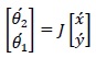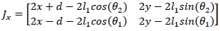 El conjunto definido por las 4 ecuaciones dadas en (5) y (7) define la relación entre las coordenadas actuadas θ1 y θ2 y las coordenadas del punto p (x, y). Si se derivan las ecuaciones respecto al tiempo y se expresan en forma matricial, las velocidades de las juntas actuadas y la velocidad del punto p se llega a la siguiente expresión,