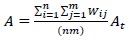 [13]donde At es el área del rectángulo inicial utilizado para estimar el espacio de trabajo, Wij es una matriz que contiene 1 si el punto puede ser alcanzado y 0 si el punto no puede ser alcanzado. Las variables n y m indican el número de puntos discretos utilizados a lo largo de los ejes x e y.