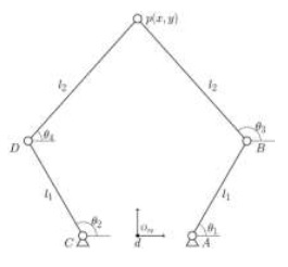 En este robot, la plataforma móvil se limita al punto p. Se emplean coordenadas cartesianas (x,y) para localizar el punto p y coordenadas de junta (θ1, θ2, θ3, θ4) para las cadenas cinemáticas abiertas.