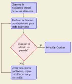 El interés de emplear los AG es que permite encontrar el mínimo global. Para una completa descripción del método se puede consultar [18]. Se incluye la Figura 4 a modo de tener una descripción general del algoritmo. El algoritmo inicia con la generación aleatoria de un número de elementos que constituyen posibles soluciones (cromosomas), al conjunto de elementos se les denomina población (PS). La generación se realiza de forma aleatoria generando valores entre 0 y 1 (genes) que forman parte de un carácter de longitud específica. La longitud del carácter (SL) es otro de los parámetros del algoritmo. A mayor longitud se tiene mayor precisión de solución, sin embargo, si es muy elevado el coste computacional hace que la solución requiera de un tiempo computacional elevado e impráctico. Cada cromosoma es decodificado en su valor en el espacio real de la variable (fenotipo) que son empleados para evaluar la función de adaptación (fitness). Dependiendo del valor de la función de adaptación unos cromosomas sobrevivirán hacia la siguiente generación y otros no. A partir de los que sobreviven, se genera una siguiente generación empleando operadores genéticos tales como cruce (crossover), mutación (mutation) copia, o combinación de dichos operadores. Cada operador genético actúa sobre un porcentaje específico de la población por lo que los parámetros porcentaje de cruce (PC) y porcentaje de mutación (PM) deben ser tomados en cuenta para la puesta a punto del AG. El algoritmo se ejecuta iterativamente generación tras generación hasta que algún criterio fijado para terminar el proceso se cumpla. Por ejemplo, se puede utilizar como criterio de parada el número máximo de generaciones (iteraciones).