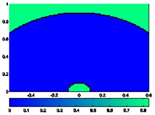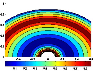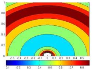 Como puede verse en la figura, para los límites de búsqueda y el parámetro de área diestra considerado (k=6.), aún hay puntos de poca destreza (franja azul oscuro). Es por lo que se procedió a aumentar el rango de búsqueda de las barras del robot y además si consideró k=3 con el objeto de aumentar la destreza.