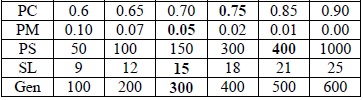 Se estudió la influencia de los distintos parámetros del AG. La Tabla 1 muestra los parámetros, así como también el conjunto de valores utilizados para ajustar el algoritmo. Se realizó una búsqueda variando un parámetro a la vez. En la tabla, PC= Porcentaje de Cruce, PM = Porcentaje de Mutación, PS= Tamaño de la Población, SL= Longitud del carácter de codificación y Gen= Número de Generaciones.