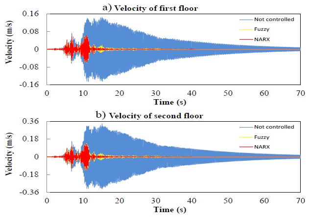 The absolute maximum velocities without control were 14.66 cm/s on the first floor and 33.57 cm/s on the second floor, and the corresponding RMS velocities of these floors were 4.35 cm/s and 9.89 cm/s, respectively. After controlling the structural responses, significant reductions in velocity values are also observed. For Fuzzy control, the velocity in absolute values for the first and second floors reduces 57% and 59%, respectively. A slightly difference is observed for the NARX controlled response, the corresponding absolute displacement values are reduced 56% for the first floor and 62% for the second. Comparing the RMS values for the velocity, a reduction of 83% is observed for the first and second floor for the Fuzzy controlled system, and for NARX controlled the reduction for the speed in both floors 84%. Basically, both control strategies provide similar structural responses.