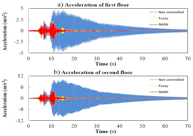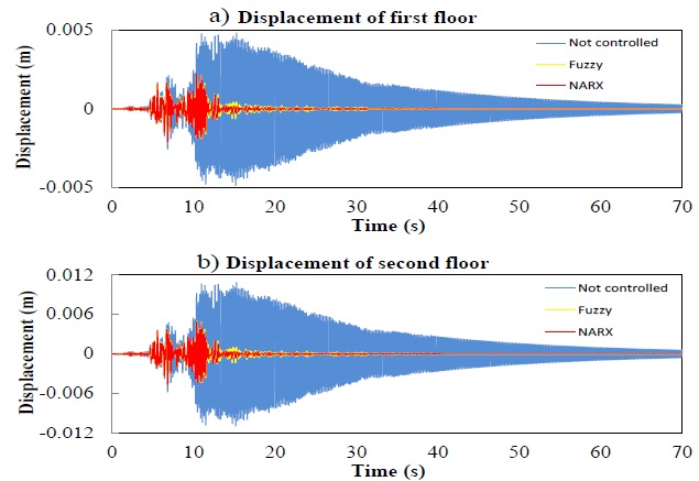 As mentioned above, it is worth noticing that the damped responses for the Fuzzy controlled structure under seismic motion are very similar to the responses associated with the NARX managing control strategy.