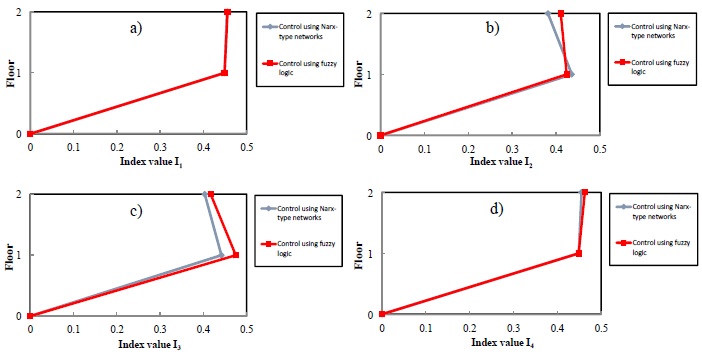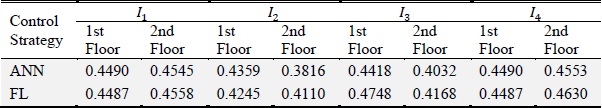 Table 8 and Figure 11 present the values of the indexes obtained by the control strategies in this study. The performance indexes of the system indicate the effective performance of the controllers throughout the system. For this case of specific loading, the equilibrium between the analyzed control strategies can be observed, particularly in indexes I1 and I4, although the numbers produced by the neural networks control are slightly higher than those of the controller based on fuzzy logic, particularly on the second floor of the structure.