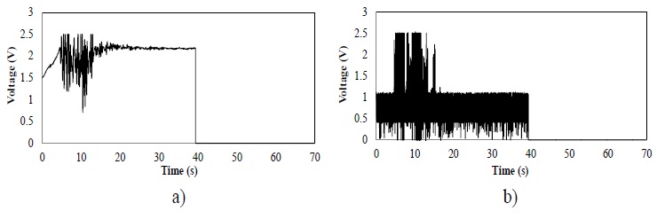 Figure 12 displays certain characteristic patterns for the voltage variations produced by the control strategies. In the case of the controller based on neural networks, as the excitation applied to the structure increases, the voltage applied to the control mechanism increases until reaching the established signal limit. The signal command produces values ranging from 0 to 2.5 volts. The controller based on fuzzy logic displays behavior that closely reflects the varying excitation applied to the structure. Thus, the range of voltages remains practically constant during the time the acceleration is varying. This voltage generally ranges between 0.4 and 1.1 volts, although voltages lower than 0.4 volts were observed at many times in the test. In addition, the voltage applied by the fuzzy controller on the dampers only exceeds the maximum voltage when the excitation increases and reaches a maximum, i.e. the limit of 2.5 volts in this study.