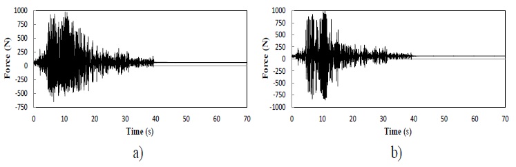 Figure 13 presents the plot of the damper forces exerted by the controllers in the time-domain. The plot suggests the way in which the force applied by the MR dampers in the ANN-based control strategy constantly reaches the maximum force delivered by the energy-dissipating devices. This behavior is not as evident in the control strategy based on fuzzy logic: the damping force varies more; this behavior is consistent with that of the voltage. This difference may be the primary explanation for the slightly better performance of controllers based on neural networks in terms of more-efficient energy dissipation and control of vibrations.