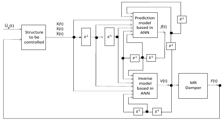The first network simulates a predictive model responsible for determining the optimal control force required by the MR damper to minimize, as efficiently as possible, the structural vibrations when external forces act on the structure’s base. In turn, the second network works as an inverse model; i.e. the network determines the input to the control plant with the delayed output of the system. Thus, the second network defines the proper voltage applied to the control device so that the latter applies a force to the structure close to the optimal force calculated by the first neural system. Figure 1 shows the schematics of the ANN-based controller.