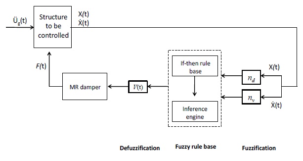 The second control strategy analyzed in this study is based on fuzzy logic. This controller is based on if-then rules that correlate the plant inputs of the system with the desired outputs. In [36, 37], it was described a fuzzy logic (FL) control process consisting of three fundamental steps: fuzzification, decision-making and defuzzification. In the first step, fuzzification, the controller converts the system inputs into fuzzy linguistic values with the use of pertinence functions; i.e., the numerical input values are converted into linguistic values. Once the system is fuzzified, the controller makes decisions based on programmed control rules while always considering the information in the system to then determine the optimal output linguistic value. Finally, the defuzzification consists of converting the optimal linguistic output value into a numerical value corresponding to the command signal that will act directly on the MR dampers. Figure 3 presents the schematics of the control project based on fuzzy logic.