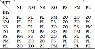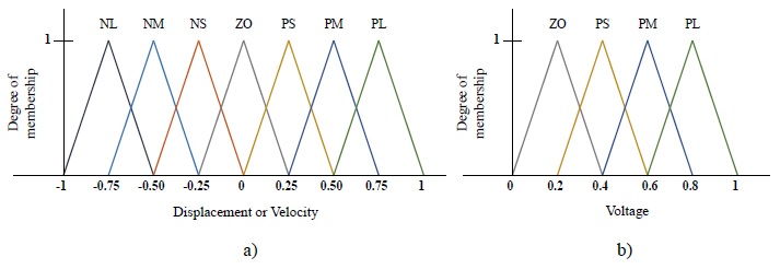 Once the linear functions used to fuzzify the numerical inputs were determined, the pertinence functions for the input and output of the controller were defined. These input functions consist of seven identical triangles that overlap one another in the center of the base and are defined in the universe [-1, 1]. In turn, the pertinence functions of the controller output (voltage) consisted of four equal triangles that also overlap one another at the center of the base and are defined in the universe of pertinence functions [0, 1]. Note that the definition of pertinence functions of the system and its universes were created in [24], and this set of rules were adapted to the heuristics data of the system under study here. Figure 4 shows schematics of the input and output pertinence functions of the designed controller, where the fuzzy linguistic designations NL, NM, NS, ZO, PS, PM and PL stand for negative large, negative medium, negative small, zero, positive small, positive medium and positive large degrees of membership, respectively.