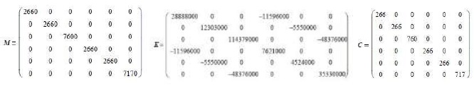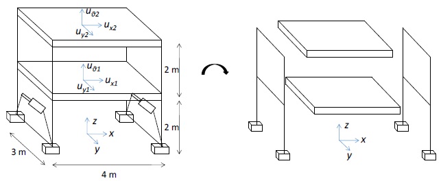 In a plain view, the building is a rectangle measuring 3m in the Y direction and 4m in the X direction. Each floor has three degrees of freedom, i.e. horizontal displacements on axis X and Y and rotation around axis Z. The structural properties of the frame are shown in Figure 6, where the mass matrix has units of kg and kg·m2, the stiffness matrix has units of N/m and N·m and the damping matrix has units of N·s/m and N·s·m.