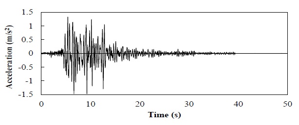 In order to apply an acceleration to the model, an acceleration record taken from [38], was applied to the base of the structure on the Y direction. This acceleration record was previously prepared by staggering it in time and magnitude, in such a way that is compatible with the dimensions of the structure, thereby resulting in a 40s duration with an absolute maximum amplitude of 1.47 m/s2, as shown in Figure 7.