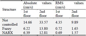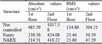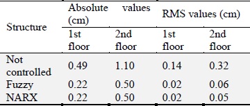 In Table 4, the absolute values of the displacements were basically the same for the Fuzzy and NARX controlled responses, but a reduction of 55% is observed when comparing these displacements with the response without control for the two floors. A further reduction is observed for the RMS displacement values, in which for the first floor achieved 86% and 84 % for the second. Therefore, it is noticed that the reduction in the responses of the Fuzzy controlled structure undergoing seismic motion are very similar to the responses associated with the NARX managing control.