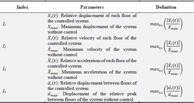 For a better evaluation of the results obtained herein from the numerical model, four performance indexes are defined in Table 7. The first three performance indexes (I1, I2 and I3) are normalized measurements of the peaks of displacements, velocities and accelerations of each floor. The fourth index (I4) is the peak displacement between the normalized floors.
