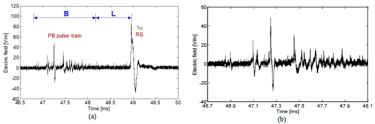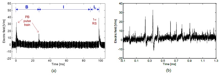 On the other hand, the BL model is related with PB pulses that might have a duration zero in the intermediate stage (I). An example of the BL model form is shown in Figure 7 and Figure 8. In this case, it is not clear the presence of an intermediate stage without electromagnetic radiations. A close up of the region that covers the PB pulse train and the FRS is presented in Figure 8a and Figure 8b. Besides, it is possible to observe that the pulses contained in the train present a random behavior and they have irregular and complex waveforms. These characteristics are common in the pulses of the PB stage.