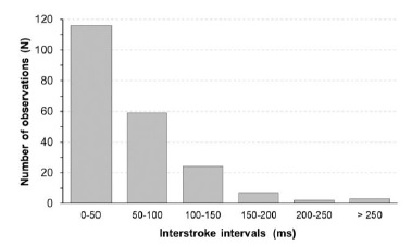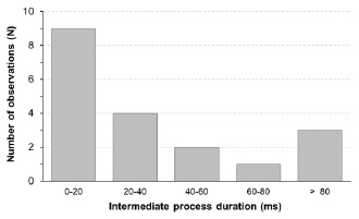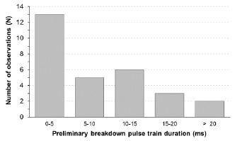 Figure 9 shows the distribution of the duration time for the 29 PB pulse trains that were analyzed. From results, it was possible to observe that the duration of the PB pulse trains changes from 800 ns to 22 ms. However, the most of the signatures revealed a PB duration between few miliseconds and 10 ms. Finally, the histogram for the duration of the intermediate zone is presented in Figure 10. This distribution reveals that most part of 19 records that agree with the BIL model present an intermediate zone with duration from few miliseconds up to 60 ms. In this case, the maximum duration was 133.2 ms.