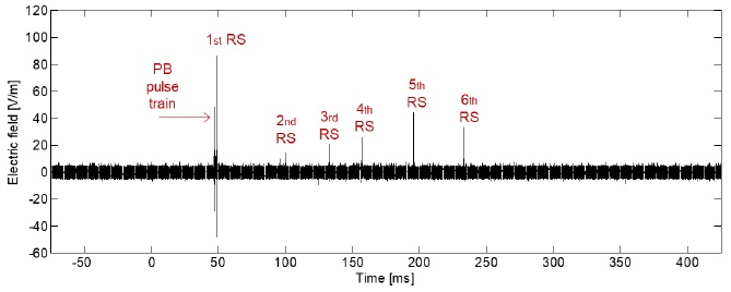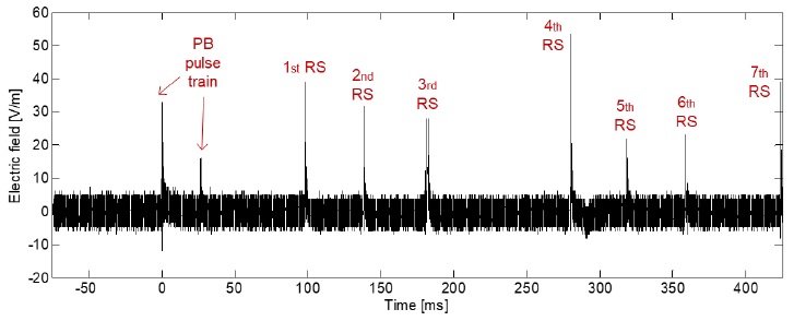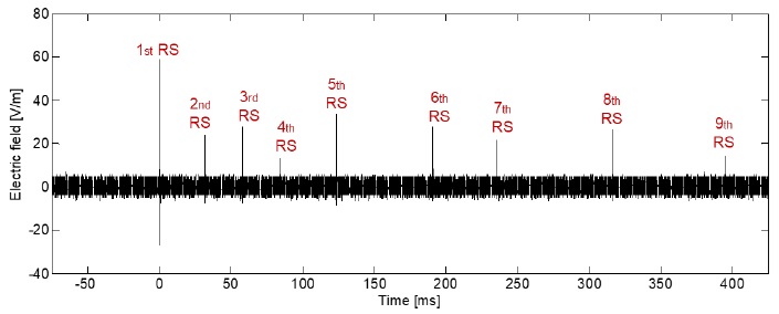 Figure 5 and Figure 6 show an example of the typical electric field changes due to the generation of a negative CG lightning flash, which is initiated by PB pulses with a BIL form (see Figure 6a). For this signature, two PB trains were observed and seven RS were recorded inside the observation window (500 ms). In this case, the magnitude of the PB pulse trains are slightly less than the amplitude of the FRS (see Figure 6b). In addition, the PB pulses and the FRS have the same polarity. However, this condition is not the same for all the recorded signatures due to random behavior of the lightning flashes.