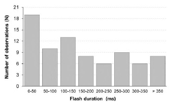 On the other hand, the flash duration was also analyzed. The distribution of this temporal parameter is shown in Figure 4. For the 79 negative CG flashes, the minimum and maximum duration were 8.8 ms and 415.2 ms, respectively. In addition, the AM was 165.1 ms, while the GM was 114.7 ms. It is important to note that multiplicity and flash duration may depend on the observation window used during the measurements. In this case, all lightning flash parameters discussed in this section were obtained using a 425 ms period (after the first RS).