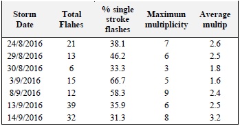 Table 1 shows the global information of the thunderstorms analyzed in this work. From 138 CG lightning signatures, 76% of the CG flashes occurred at distance larger than 50 km from the measuring station. It was also observed that 127 (92%) flashes had negative polarity, while the remaining 11 (8%) were positive flashes. These percentages are similar to those reported by several researchers [3], [18], [19]. In addition, the average number of strokes per flash was 2.4 and the maximum multiplicity was nine (9) strokes. The flash with the maximum multiplicity was recorded on September 8th at 19:33:59 as illustrated in Figure 2.