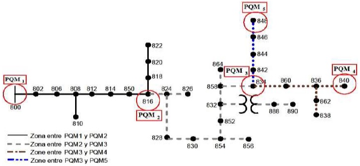 El número y la selección de los puntos en derivación como candidatos a la instalación de monitores está condicionado a: la topología de red, la longitud de los alimentadores y las zonas de red establecidas por los puntos en derivación seleccionados (Figura 1). Además, también se tiene en cuenta el tipo de usuario en la zona de red y la frecuencia de falla del tramo de red. Estos criterios dependerán también de las condiciones de operación del sistema eléctrico y de la necesidad particular de monitorización.