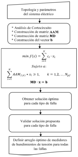 En la Figura 2 se presenta el diagrama de flujo del método propuesto para determinar el arreglo óptimo de monitores de hundimientos de tensión, teniendo en cuenta restricciones de localización de fallas en la red.