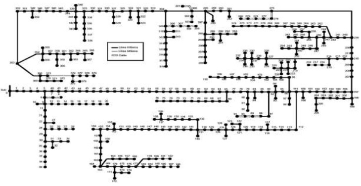 En la Figura 3 se presenta la red real de distribución de energía eléctrica de un operador de red en Colombia caracterizado por contar con segmentos de red trifásicos, bifásicos y monofásicos. Además, tiene 379 barras (de los cuales 153 poseen carga y 4 cuentan con equipos de compensación capacitiva). La tensión nominal de operación es de 13,2 kV y la carga típica de operación es de 5,3 MW, con una compensación capacitiva total que alcanza los 1,05 MVAr.
