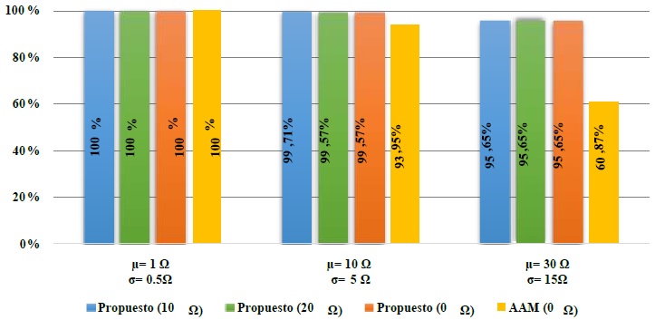 Los resultados presentados en la Figura 4 validan el bajo rendimiento del método clásico basado en la AAM, a la hora de garantizar la observabilidad, a medida que la resistencia de falla aumenta. Respecto a la metodología propuesta, se consigue una observabilidad dentro de rangos aceptables para los escenarios analizados (0 Ω, 10 Ω y 20 Ω). Además, también se puede observar que la instalación de cinco (5) monitores (barras 5, 111, 239, 353 y 356) cumplen las restricciones de observabilidad y de localización relativa de fallas en la red. Esto se logra mientras se mantiene un aceptable factor de observabilidad de hundimientos de tensión para cada una de las fallas registradas en la red de distribución objeto de estudio.