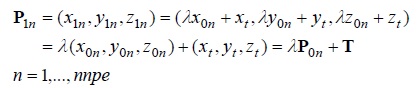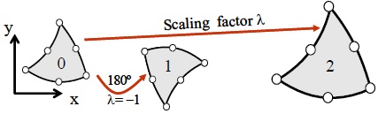 Let W1be another isoparametric finite element, geometrically similar to W0, such that its nodal coordinates, P1n, can be obtained using a linear transformation by scaling the nodal coordinates of W0 by an scaling factor l and by imposing a translation by means of a vector T=(xt, yt, zt):