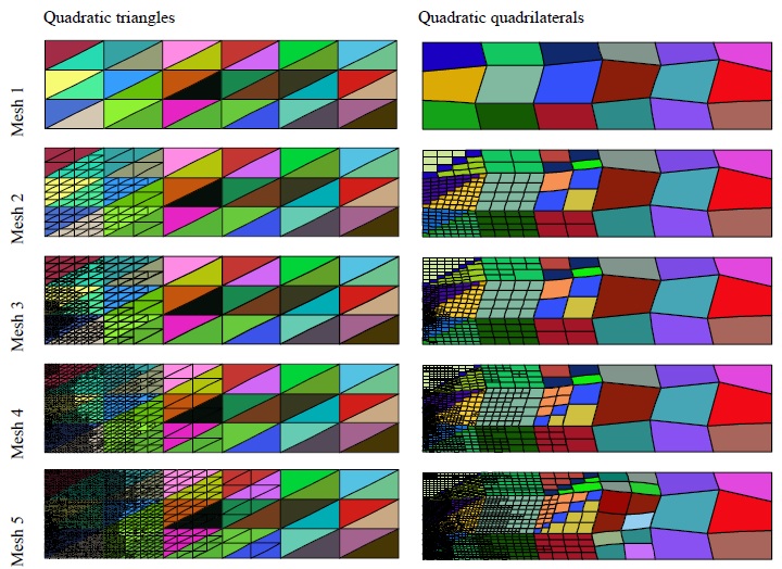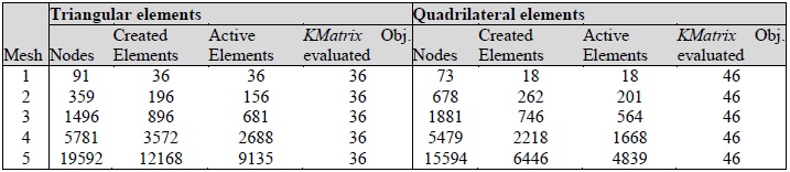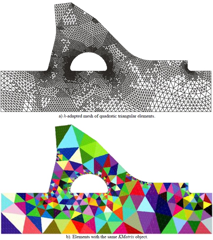 Figure 10 shows two sequences of h-adapted meshes, obtained with quadratic triangles and quadrilaterals, used to analyse the problem represented in Figure 9. Note that some of the quadrilateral elements used in the first mesh of the sequence were deliberately distorted to illustrate the use of quadrilateral elements of arbitrary shapes. In Figure 10 all the elements associated to the same KMatrix object have been represented with the same colour. The statistics of the mesh sequence have been shown in clearly shows the advantages obtained when the hierarchical relations between elements are used. For example, when triangular elements have been used, the last mesh in the sequence contains 9135 elements, some of them with a refinement level r = 11, and has required the creation of 12168 elements. However, only 36 KMatrix objects have been evaluated to create the problem stiffness matrix for this mesh with 19592 nodes.