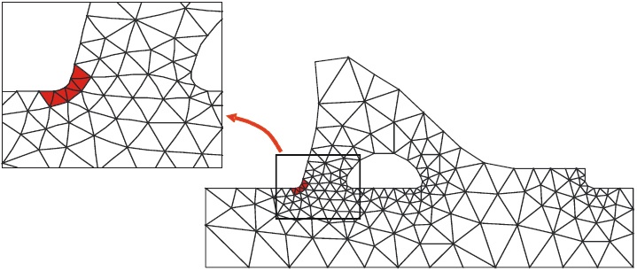 The hierarchical data structure has been used to define the area of interest in more refined meshes, by simply taking into account that when a parent element into the area of interest is subdivided into four children elements, the children elements will also be part of the area of interest. A detail of mesh 4 of the h-adaptive mesh sequence around the area of interest is represented in Figure 12.