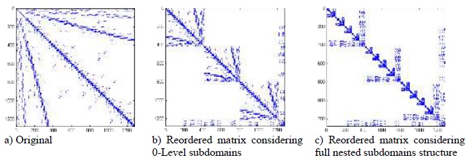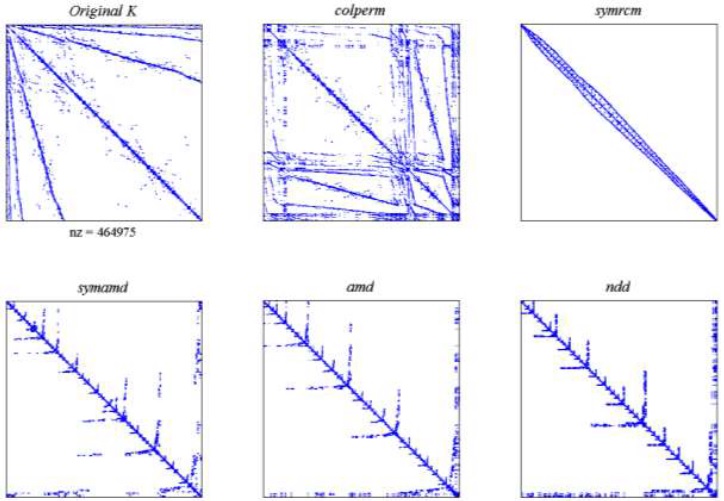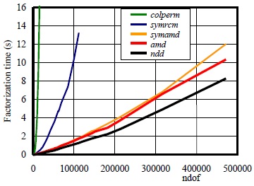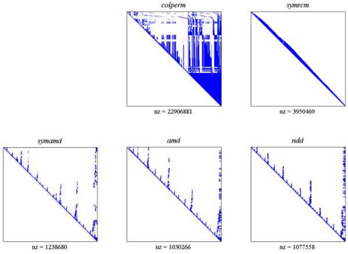 Figure 15 shows an example of comparison of the reordered matrices obtained with the different permutation schemes. It can be observed that the methods that produce the best performances of the Cholesky factorization, the symamd, amd and ndd permutations, produce similar reordering patterns.