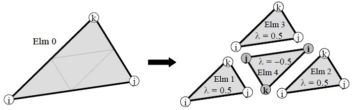Figure 2 shows a parent linear triangular element that has been subdivided into 4 child elements placing new nodes at the mid-side point of each element side.