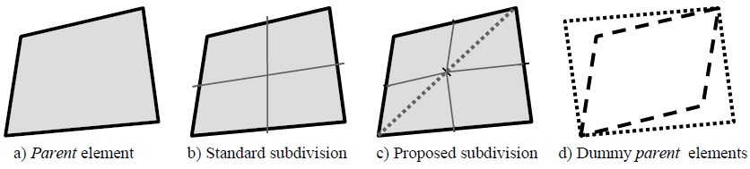For this linear quadrilateral elements, the element subdivision procedure proposed in this paper and represented in Figure 3.c), consists of joining the mid-side points of each side of the element with the mid-side point of any of the diagonals of the quadrilateral (the longest diagonal has been considered in the implementation). As shown in Figure 3.c, the child elements located over the selected diagonal will be geometrically similar to the parent element, whereas the other two child elements created, which are not similar to the parent element, will be parallelograms. Therefore, if any of the child elements is further subdivided, the new elements created will always be geometrically similar to either the original parent element ( Figure 3.a)) or the dummy parallelogram parent elements represented in Figure 3.d).