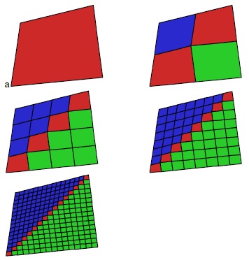 Figure 4 represents a sequence of successive subdivisions of the element represented in Figure 3.a). The same colour has always been used to represent all the geometrically similar elements. It can be clearly observed that, for any subdivision level, only 3 different kinds of geometrically similar quadrilaterals will appear.