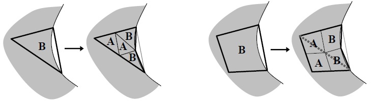 Two different types of parent elements are generated during the mesh refinement based on subdivision of elements. Type A elements are defined as parent elements whose child elements are geometrically similar which will, therefore, inherit the element calculations. On the other side, type B elements are defined as parent elements with at least one child element not geometrically similar.