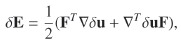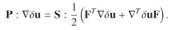 (9)se puede escribir el trabajo virtual de las fuerzas internas en función del segundo tensor de tensiones de Piola-Kirchoff y del tensor de Green de los desplazamientos virtuales en la configuración inicial como: