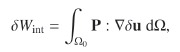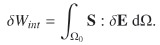 (6)Como se ha mencionado anteriormente, el problema elástico se resuelve utilizando el método de los trabajos virtuales en el que se plantea el problema de forma débil integrando en la configuración inicial. Ello da lugar a la formulación lagrangiana total. Debido a que en este caso no se consideran fuerzas externas aplicadas, solo se considera el trabajo virtual de las fuerzas internas, que expresado en la configuración inicial, toma la siguiente forma: