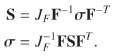 (5)El segundo tensor de tensiones de Piola-Kirchoff es simétrico y relaciona las fuerzas y las áreas sobre la configuración inicial no deformada. La relación entre el tensor de tensiones de Cauchy y el segundo tensor de tensiones de Piola-Kirchoff es la siguiente: