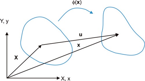 Para medir la deformación de Green observemos la figura 1 donde en la parte izquierda se representa la configuración inicial del sólido sin deformar, mientras que a la derecha se representa el sólido deformado. Como se observa, cada punto X en la configuración inicial se encuentra en la posición x en el sólido deformado, siendo u el desplazamiento sufrido por dicho punto.