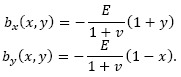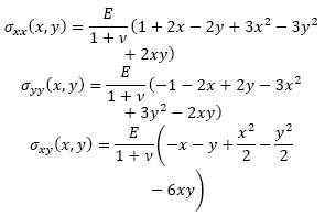 (41)Los valores exactos de las componentes de tensión se aplican sobre el contorno de Neumann, indicado por la línea discontinua en la Figura 3. Las tensiones a imponer como condición de contorno del problema de elementos finitos, se obtienen a partir de la solución en desplazamientos bajo condiciones de deformación plana, y se escriben: