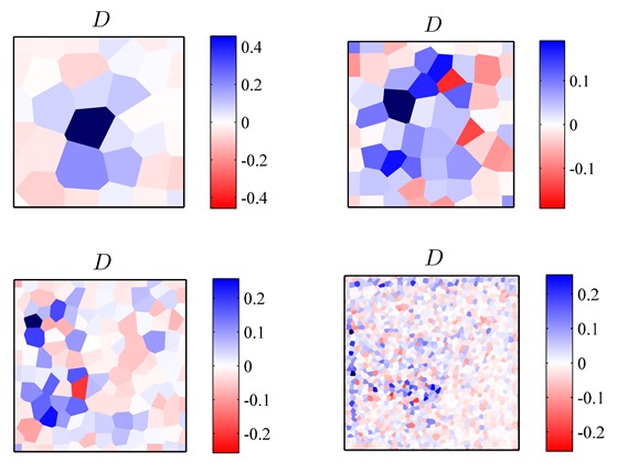 En la Figura 5 se muestra el índice de efectividad local, D, para las mallas utilizadas de elementos poligonales. Se observa que los valores locales se acercan al valor ideal de D = 0. Se nota para este problema un balance de zonas donde el error exacto se sobreestima (azul) y zonas donde el error se subestima (rojo).