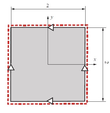 Se modela una placa cuadrada de 2×2, como se muestra en la Figura 3, con propiedades del material dadas por 𝐸=1000 para el módulo de Young y 𝜈=0.3 para el coeficiente de Poisson. El problema se define de forma que la solución exacta del problema elástico en desplazamientos está dada por