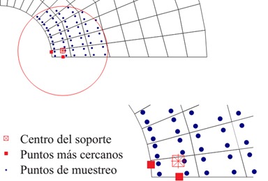 La ecuación de equilibrio en el contorno debe satisfacerse en cada punto a lo largo del contorno de Neumann. En [24, 25, 26], considerando una técnica tipo SPR (superconvergent patch recovery), se imponen condiciones de equilibrio en el contorno utilizando multiplicadores de Lagrange. Sin embargo, este enfoque produce discontinuidades en una formulación MLS cuando pasamos de un soporte en el interior del dominio a un soporte que se interseca con el contorno.