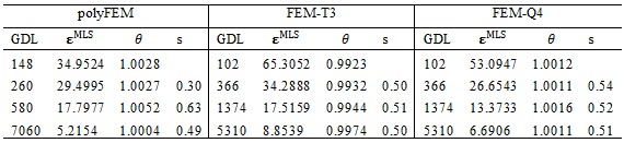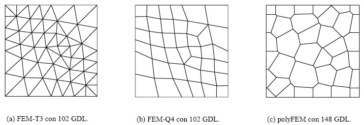 (43)Los resultados se obtienen para secuencias de cuatro mallas de elementos poligonales, polyFEM, y se comparan con mallas de elementos finitos convencionales con elementos cuadriláteros lineales, FEM-Q4, y triángulos lineales, FEM-T3. En la Figura 4 se muestran las primeras mallas de la secuencia de refinamiento uniforme utilizada para cada topología. Para un mismo número de grados de libertad (GDL), las mallas de polígonos de 𝑛-lados tienen más elementos a menores valores de 𝑛, siendo máximo para triángulos, con 𝑛=3. Las mallas se construyen de forma que se mantiene un número similar de GDL para los tres tipos de elemento a medida que se refina. Para evaluar el error se utiliza la técnica de reconstrucción MLS propuesta.