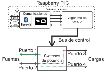 Es el encargado de brindar al IPS las funcionalidades de comunicación y control. Para esto, es posible hacer uso de protocolos de comunicación inalámbrica como el Bluetooth o el Wifi, o protocolos cableados como el UART, el I2C, el SPI o el USB para intercambiar información con las fuentes de energía, las cargas, otro IPS, la red comercial y los usuarios. De esta manera, es posible conocer la información relacionada con la demanda de las cargas, la capacidad de energía que pueden suministras las fuentes y la tarifa de la energía eléctrica. Esta información es importante ya que son los parámetros de entrada para el algoritmo de control encargado de la apertura o cierre de los switches de la etapa de potencia. Adicionalmente, es posible enviar información al proveedor del servicio y a los usuarios por medio de la conexión a internet.