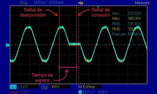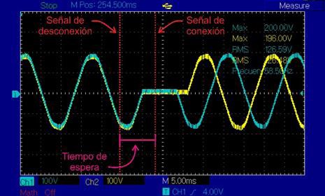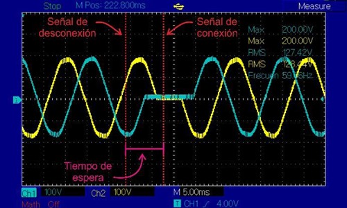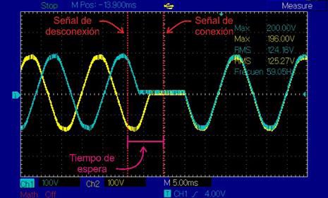 Igualmente, se evidencia que el uso de un tiempo de espera de medio ciclo de onda del periodo de la red permite que los alternistores tengan una desconexión (apertura) natural, lo cual es posible debido que durante el tiempo de espera la corriente llegue a su cruce por cero. Es importante resaltar que debido a que las cargas utilizadas son netamente resistivas, las señales de corriente y tensión se encuentran en fase. Sin embargo, al momento de usar cargas inductivas el tiempo de desconexión puede cambiar dependiendo de su factor de potencia.