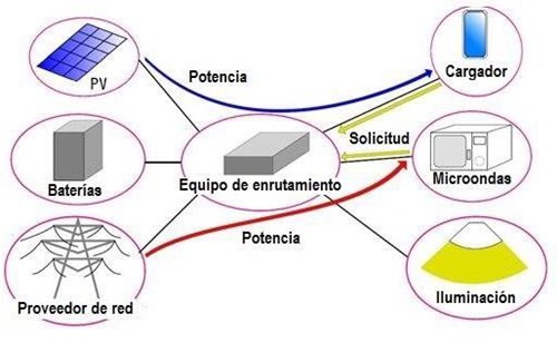 Para lograr esto, el sistema está compuesto por una terminal de información y por el enrutador de potencia (Figura 4). De esta manera, el enrutador recibe la información por medio de un protocolo de comunicación (por ejemplo Power Line Communications - PLC) y posteriormente selecciona una fuente de energía eléctrica adecuada a las características de la carga [6]. Esto implica que el sistema esta administrado de forma centralizada, permitiendo que las cargas que incorporan baterías tengan un suministro de potencia relativamente de baja calidad. Mientras que, por el contrario, la energía eléctrica comercial de alta calidad se suministra preferiblemente a cargas o equipos importantes, tales como instrumentos médicos, que no tienen la tolerancia a la caída de tensión momentánea. Así, el equipo de enrutamiento decide utilizar fuentes de energía renovables tanto como sea posible [6].